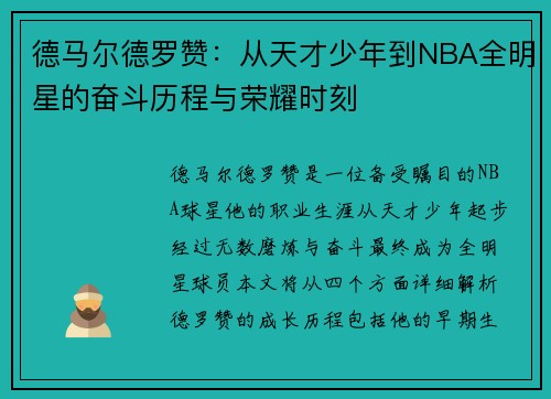 德马尔·德罗赞是一位备受瞩目的NBA球星,他的职业生涯从天才少年起步,经过无数磨炼与奋斗,最终成为全明星球员。本文将从四个方面详细解析德罗赞的成长历程,包括他的早期生活、篮球生涯初期、在NBA的成就以及个人荣誉与影响力。通过这些方面,我们不仅可以看到德罗赞如何克服重重困难,实现自己的梦想,也能感受到他对篮球这项运动的热爱和执着。希望通过本篇文章,读者能够更深入了解这位优秀运动员背后的故事,以及他在篮球史上的地位。
